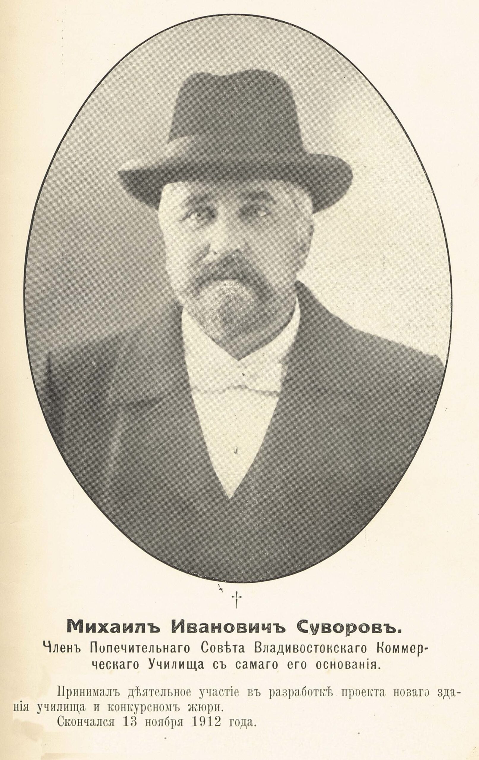 «Владивостокский Савва Морозов», как называли Михаила Суворова, начал свою деятельность в 1882 году рядовым строительным подрядчиком. Со временем Михаил Иванович обзавелся собственным производством: построил спичечную фабрику, литейную и механическую мастерские, лесопильный и красочный заводы. Эти предприятия давали Суворову возможность заниматься тем, к чему у него больше всего лежала душа: помощью обездоленным и неимущим.